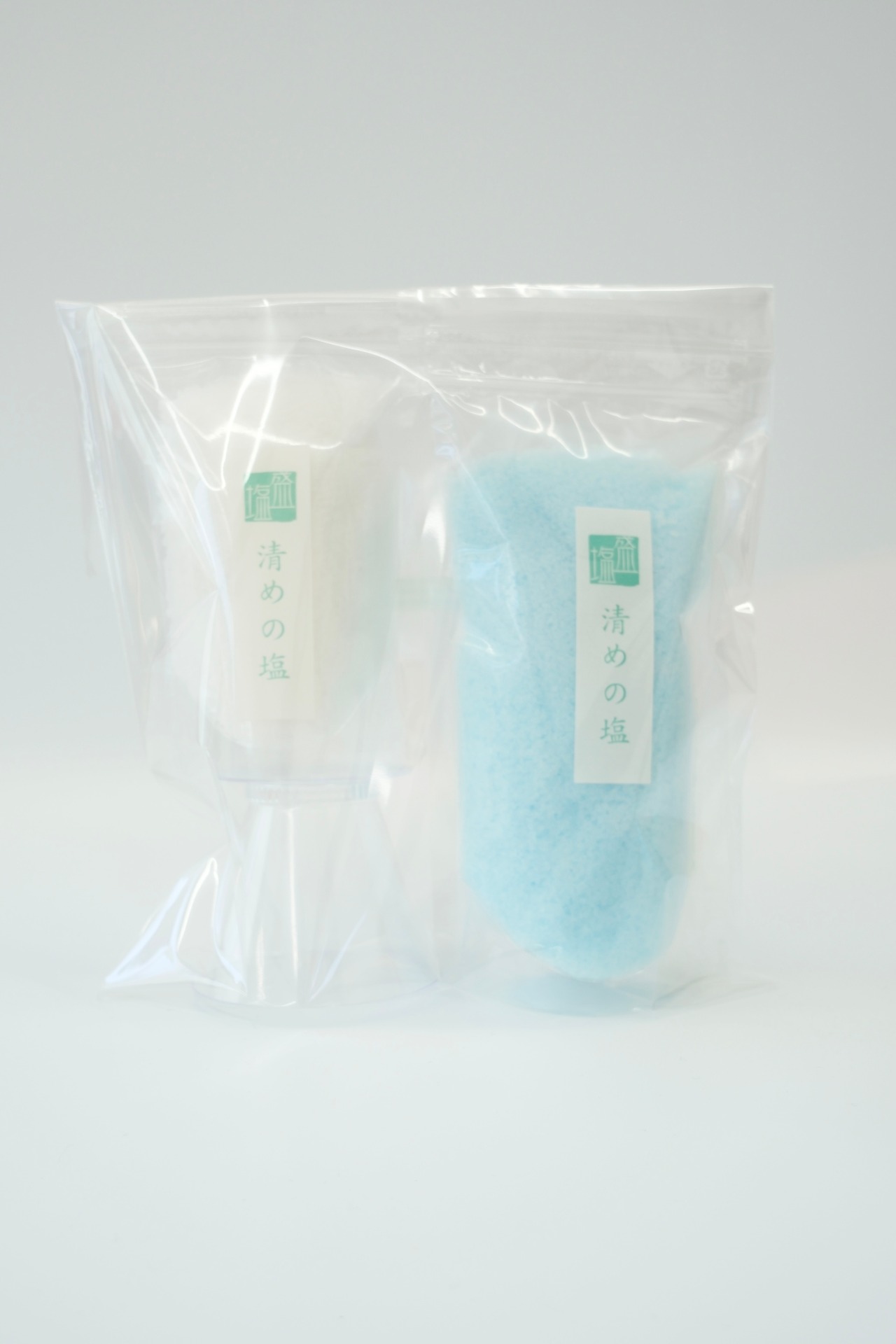 直火釜炊き 美しい結晶の「あらしお」を、やさしいブルーに染め、富士山の盛り塩セットにしました!